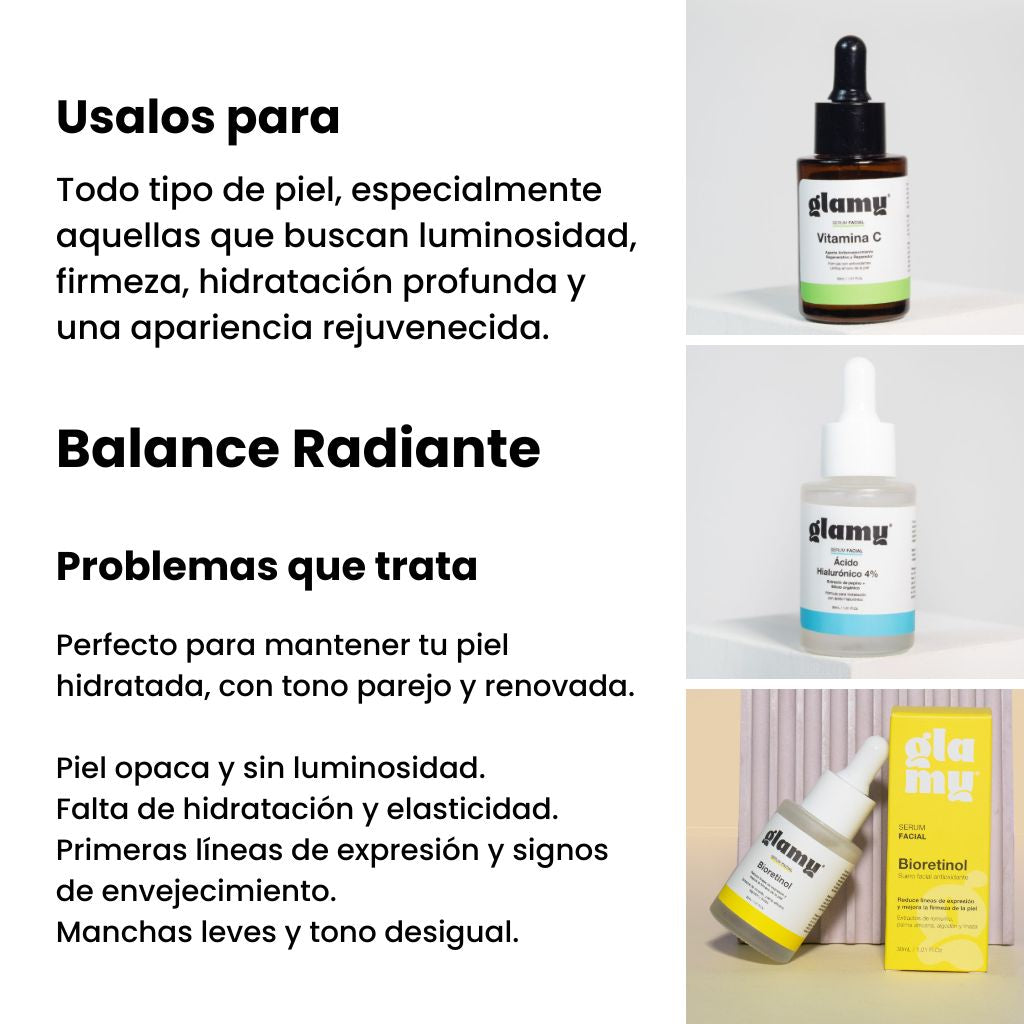 El Kit Balance Radiante de Glamy combina tres poderosos sérums faciales para un rostro radiante, hidratado y con una textura mejorada. El sérum de ácido hialurónico aporta hidratación profunda, el sérum de vitamina C ilumina y unifica el tono de la piel, mientras que el sérum de Bioretinol ayuda a renovar la piel y a combatir los signos de envejecimiento de forma suave y efectiva. Ideal para quienes buscan un tratamiento completo para hidratar, iluminar y rejuvenecer la piel, manteniéndola equilibrada y saludable.